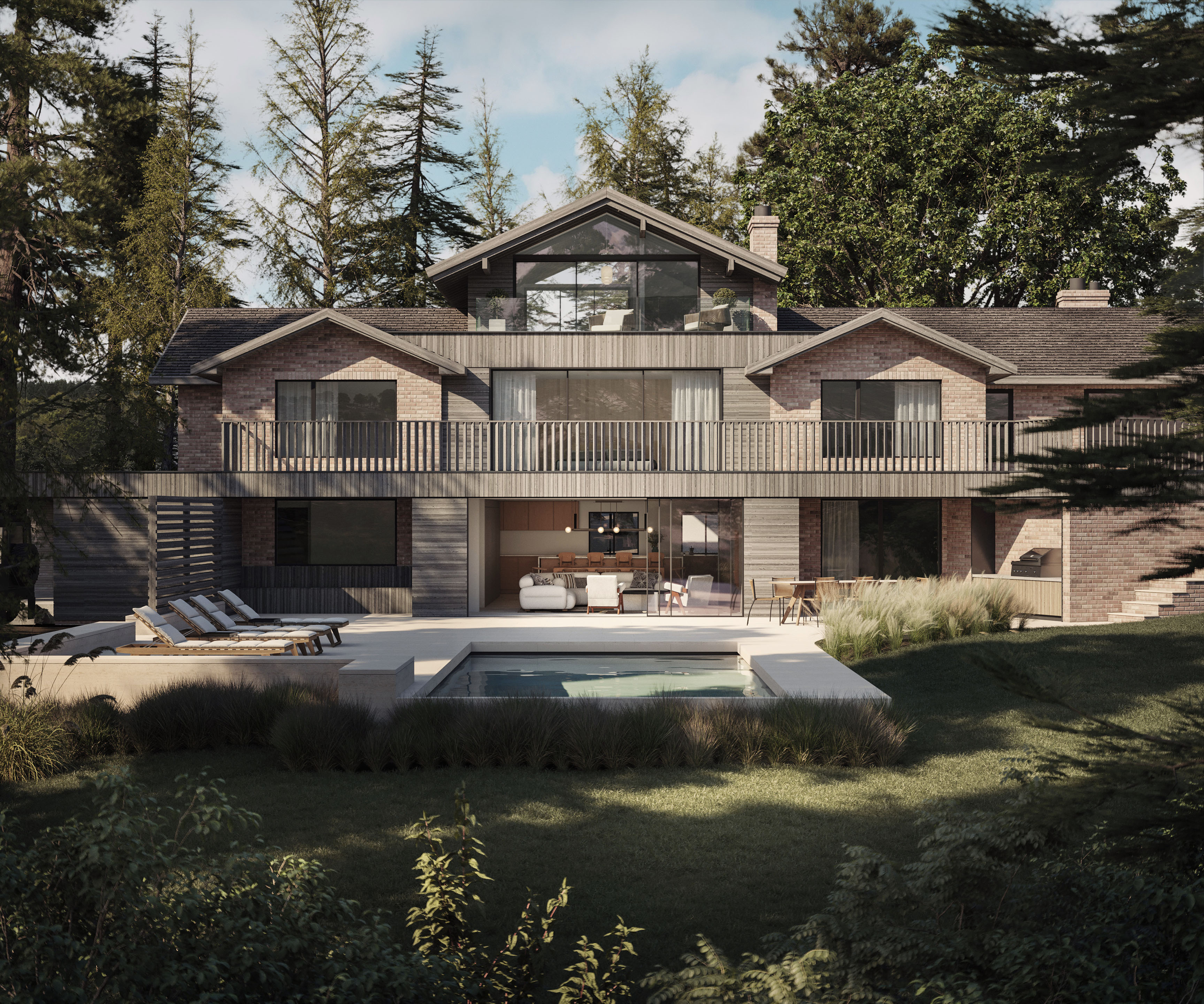 The architecture is subtly refreshed with a restrained material palette that complements the woodland context. Timber elements and softer tones sit comfortably within the landscape, allowing the house to feel more integrated with its surroundings.