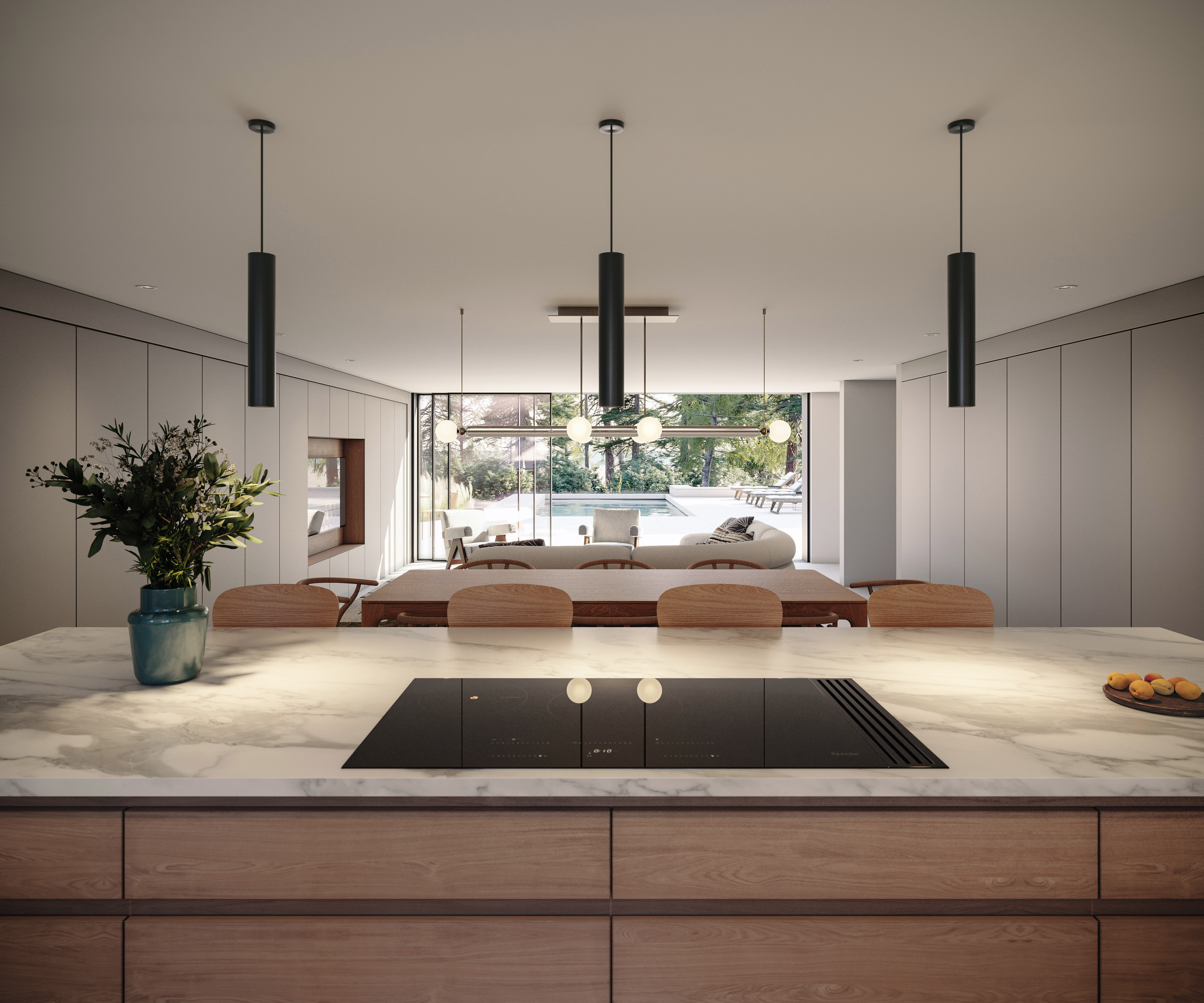 Externally, the garden is reshaped to create a series of connected outdoor spaces including a terrace and swimming pool, positioned to enjoy views across the surrounding woodland. These new external areas extend the living spaces into the landscape, encouraging a stronger relationship between the house and its setting.